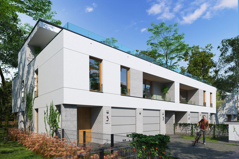 Wycofane względem elewacji frontowej poddasze pozwoliło, na ukształtowanie tarasów nad piętrem budynku. Ostatnia kondygnacja została zwieńczona niskim kopertowym dachem. Prosta i współczesna konwencja budynków nawiązuje do zabudowy najbliższego otoczenia i w harmonijny sposób koresponduje z zielenią wysoką osiedla i jego okolicy.